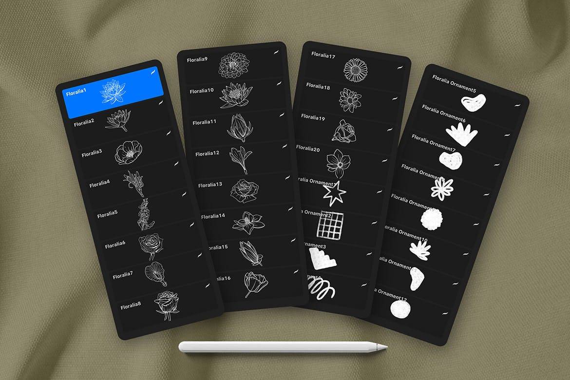 Procreate花卉线条艺术30组笔刷包下载。给大家介绍一下Procreate Floralia线条艺术笔刷。该笔刷包有25个美丽形状的笔刷,并且还有额外的抽象形状笔刷。可用于你的插画作品中。这些笔刷是为iOS应用程序Procreate准备的,无法在PHOTOSHOP或SAI其他应用程序使用哦。