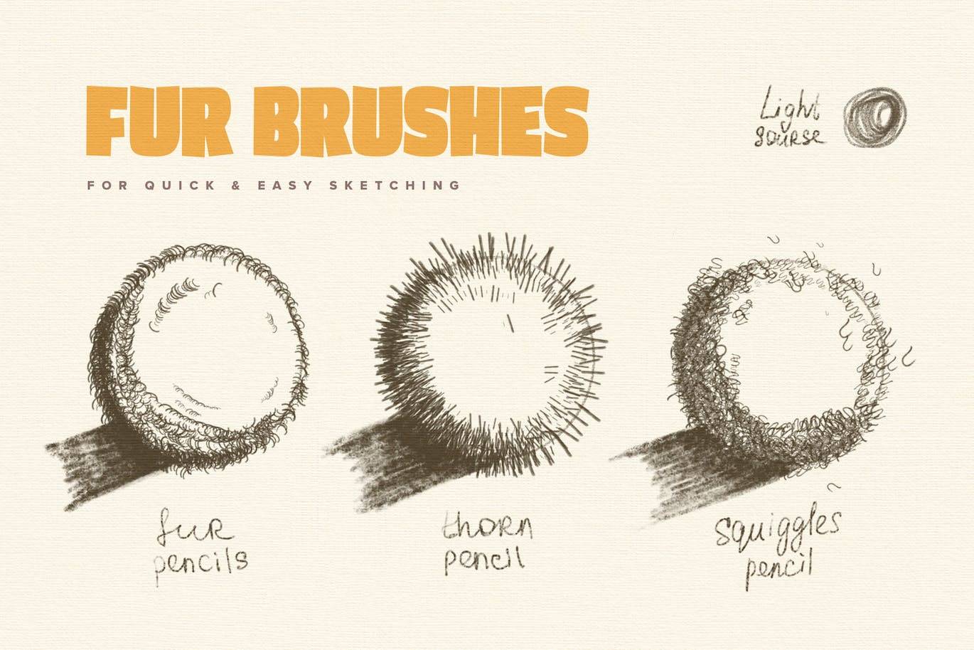 它不仅仅是素描,当你需要为你的插图做阴影和纹理时,这些笔刷就是你的最好帮助。它们可以帮助你节省大量宝贵的时间,用小圆圈、曲线和笔触来填充你的形状,有12个画笔。