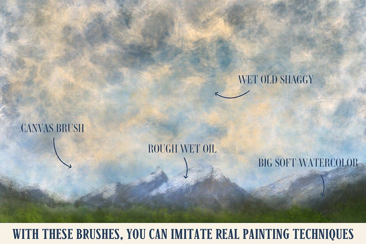 我还做了很多不同质地的油画笔,你可以选择有光泽的油彩,厚实的糊状油彩或有砂砾状油裂的笔刷使用。在这套笔刷系列中,也有各种水粉画笔。它们拥有非常真实的效果,用大的柔软的水彩画笔,你可以画出更大的空间或为你的插画添加云雾状的纹理。21支Procreate画笔,包含油画、水粉画、丙烯画等等。