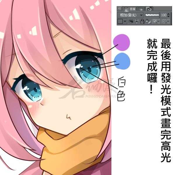 再次新建图层,给眼睛下方的位置加入亮色调。可以选择一个比虹膜色彩更亮的颜色。