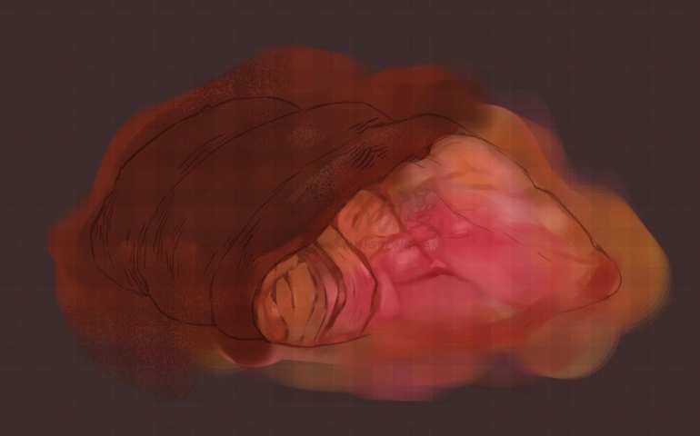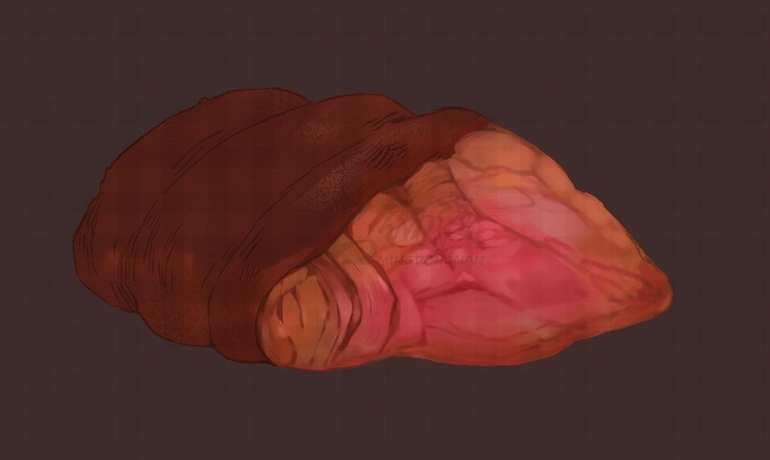 根据我们线稿阶段决定下来肉块的纹理走向,开始处理大的明暗变化。如果担心颜色不好掌控的话,可以灵活使用图层效果(线性加深或者色彩增值)来进行微调整。