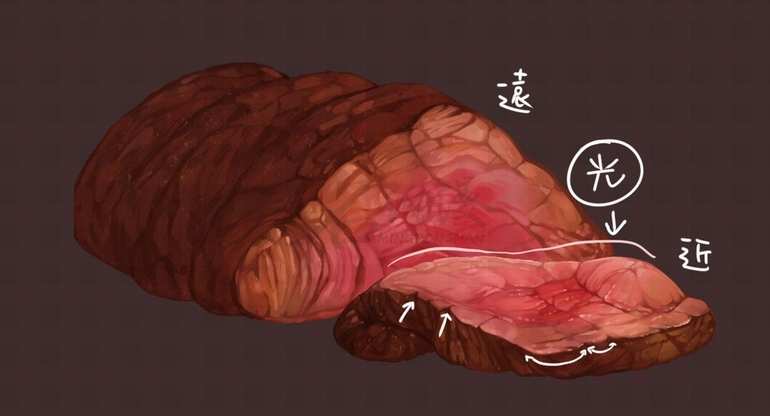 其中熟肉部分因为水分会被吸收,会逐渐产生类似木头一般的纹理构造。而相较之下半生半熟的地方会显得比较软嫩,我们就需要做出这两者的材质区别。