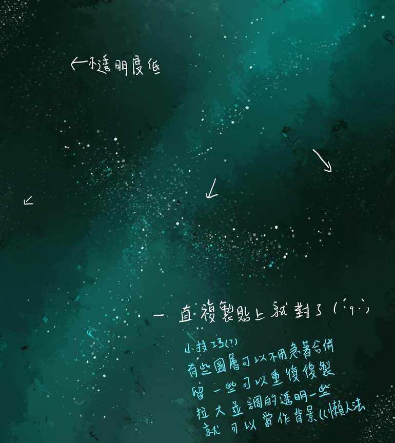 (1)星空和底色不同,它会呈现出冷光效果。因此我们用一个偏蓝的亮色刷在画面中。