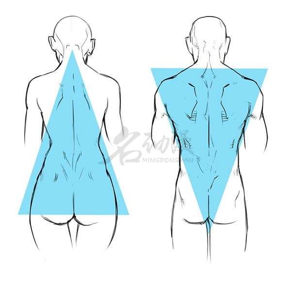 找准男女背部结构上的差异后,我们就可以通过简单的几何形,来概括出大致的背部结构。