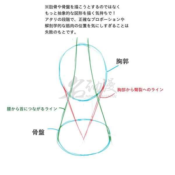头部是个球体结构,这个很多同学都知道,要画出来。另外后颈部还有两条连线,是直接延伸到骨盆位置的。