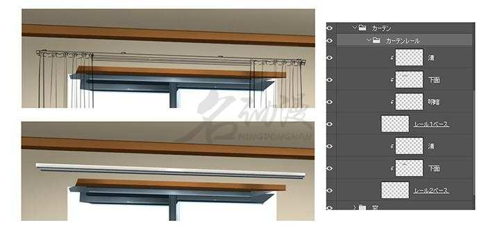 窗帘轨道就是让我们能够滑动窗帘的结构。一般它会有两排平齐的结构,我们只需要注意让正面保持更亮一些,背面偏暗即可。