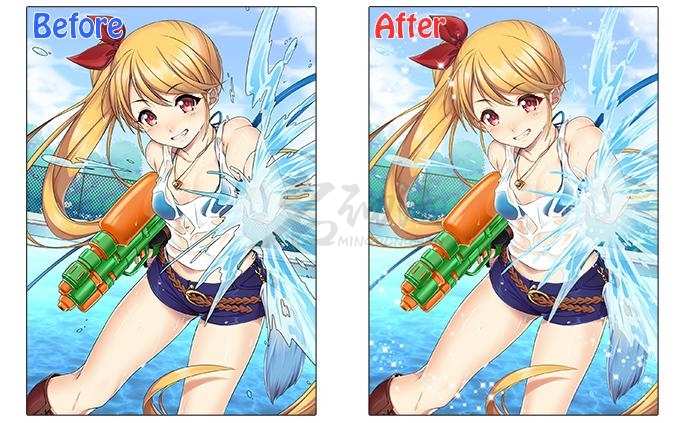 尤其是水花和头发的效果,因为我们在处理轮廓的时候没有考虑到物体应有的材质,结果就感觉很硬。