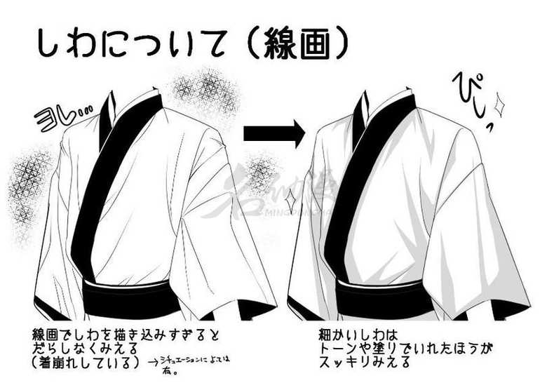 这也是很多同学画线稿时的老毛病了,褶皱太多往往意味着和服的磨损和破旧。尤其是正式场合里的和服,不能有太多的褶皱。