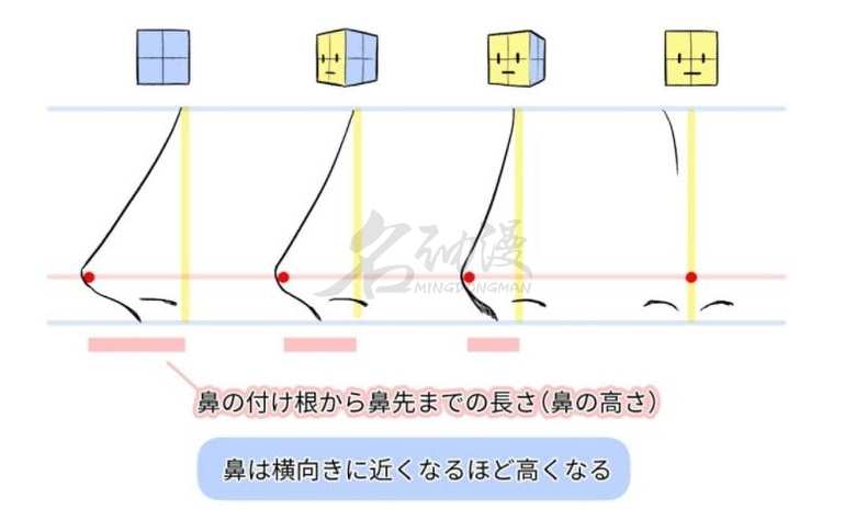 鼻子的高度是根据人物面朝的方向和人物看到景观或物品的角度来跟着人物的五官来决定的。例如低头看手机、转头等的动作。