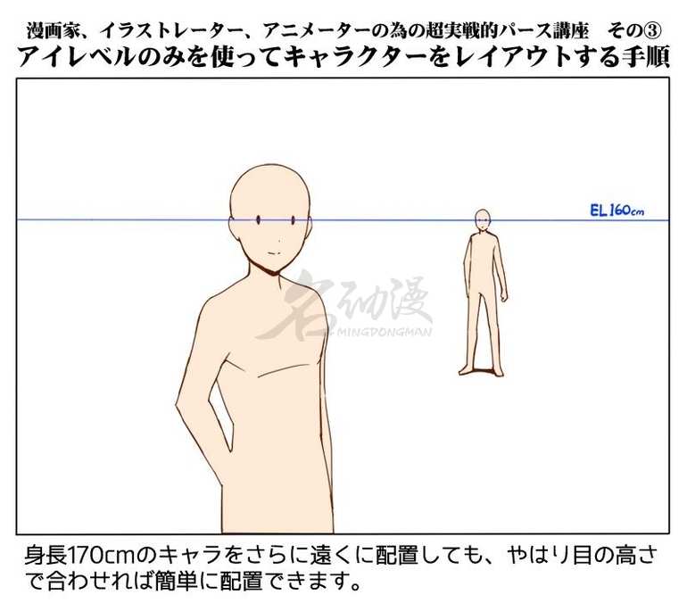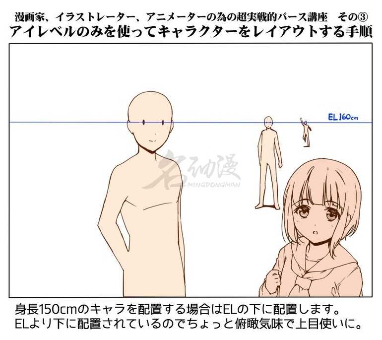 前面我们已经确定视平线高度是160cm,那么这个150的小姑娘全身就是在视平线之下,呈现出俯视的效果。