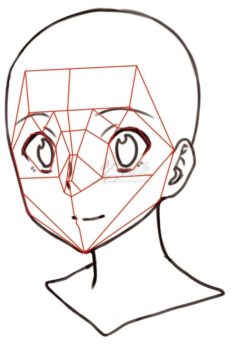 (1)先做出一个圆,概括出头部,然后画出内切正方形和十字线。