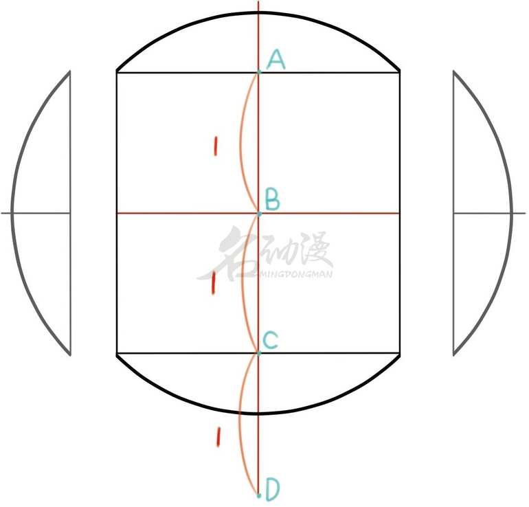 (2)裁掉圆的两边,其中正方形和圆中心线相交的ABC三点位置,分别就是发际线、眉毛、人中(鼻子和嘴巴中间)的位置。