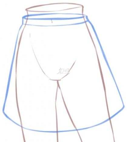 第二步:接着在腰部处刻画出裙子的裙口处(就人物的腰部位置),将腰两侧的与裙摆连接(蓝线)。特别注意在刻画裙口时,不能直接贴在腰部,因为裙子时有厚度的,所以要与腰部留一点缝隙,表示裙子的厚度感。如图所示: