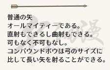 箭包括箭头、箭杆和箭羽。箭头为铜或铁制(现代的箭头多为合金),箭杆多用竹制,也有木制的,箭的飞行速度和准确性与尾羽的关系密切。箭羽太多,飞行速度慢;太少,稳定性差。不同的弓要结合不同的箭才能充分发挥出自身的实力,因此长弓用的箭,对空气阻力很强,箭飞出去的速度衰减程度也很小。短弓用的箭,是能直接射击和弯曲射击的全方位的箭。十字弓用的箭,通常又粗又短,变得很重,因此它射程更远、穿透力更大。画弓箭技巧:长弓配长箭,画弓箭时要时刻注意这点。