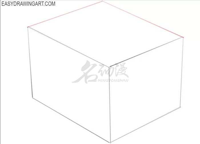 第二步:正方体画完后,其实已经将箱子的整体轮廓画出来了,只要我们增加一些细节就可以轻松将箱子的雏形画出来啦。比如,箱子是要装东西的,因此会在上方做一个活动口,所以我们将这活动口的线条画出来。红线代表的是箱子的封口,这样一画活灵活现的箱子就出来了。