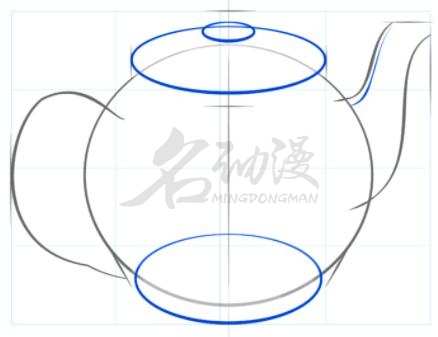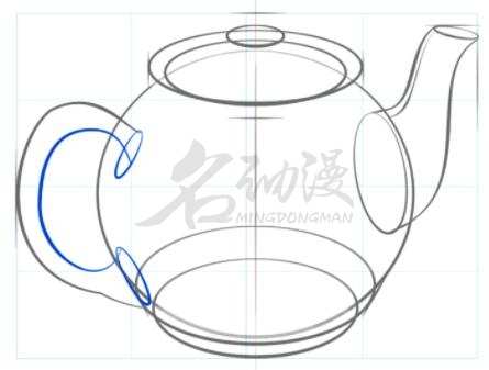 第二点:画出手柄和壶嘴的大概轮廓形状,用两个椭圆形勾勒出茶壶的底部和盖子。如图所示: