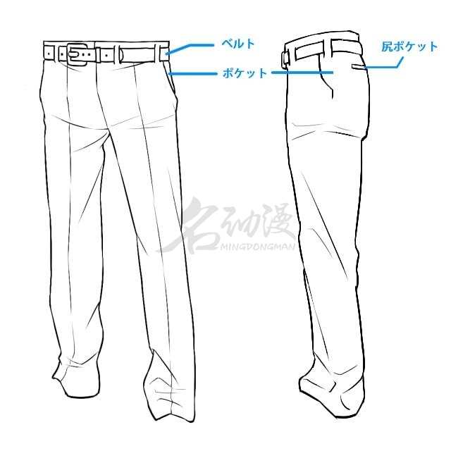 通常裆下、手肘、脚踝容易出现褶皱。而肩膀有衬垫,因为很硬把布料承托起来,所以不会皱。腰的束因为被上衣遮住,醒目的褶皱很难形成。注意过度的增加褶皱的线条数量的话会让制服看起来像丝绸面料一样薄,少了笔直感。画画时随着皱纹线的位置,阴影也画在胯下,胳膊肘,脚踝上,这样就能展现出褶皱的感觉。而脚踝的下摆会压到鞋子上,这里是特别容易产生褶皱的地方。