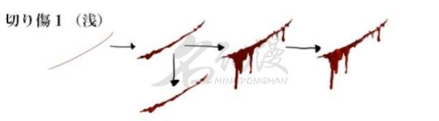 第二步:伤口深浅的表现手法并不一样,通常为了表现浅浅的划伤会画出血液从伤口流淌下来的效果,而较深伤口的画法则是将划痕画大一些,调低伤口较深部位的亮度。