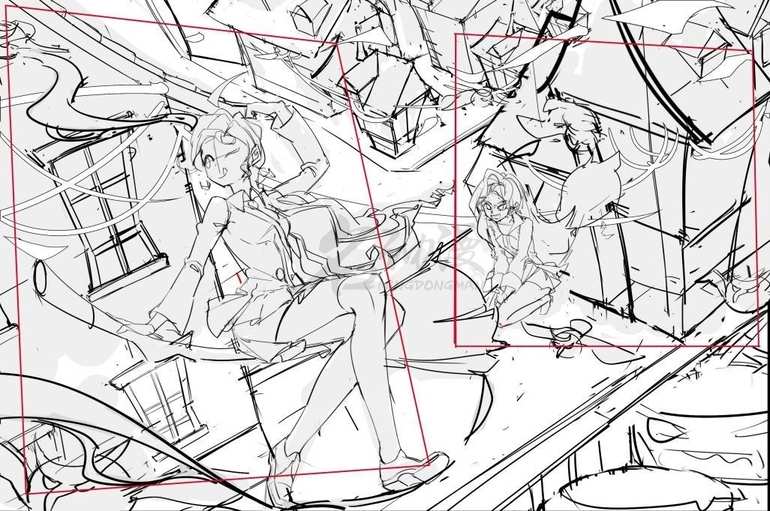 而蓝线区域的透视则是从上到下的,所以蓝色区域就由上大到下小的形成了画面纵向透视关系。