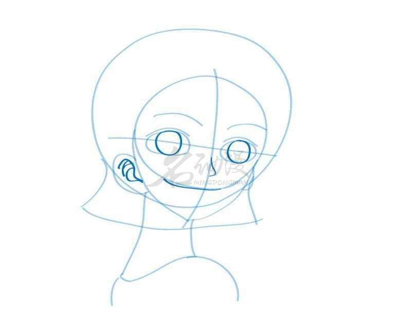 第一步:首先用圆形概括出娜美的头部轮廓,画上十字五官定位线,到画出眼睛的位置以及头发的外轮廓,最后画出脖子和肩膀。这样娜美的外部轮廓就画好了。
