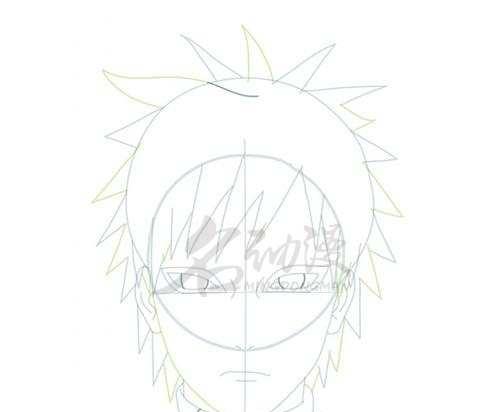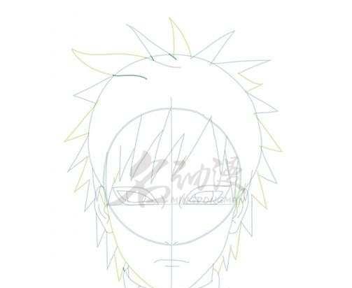 第一步:首先画出我爱罗的头部,然在头顶画出一个比头大的半圆,这里是发顶的位置,然后画出眼眶以及嘴巴和鼻子,再用几根线条概括出刘海的发束,最后画上耳朵,这样我爱罗的头部就有了雏形。