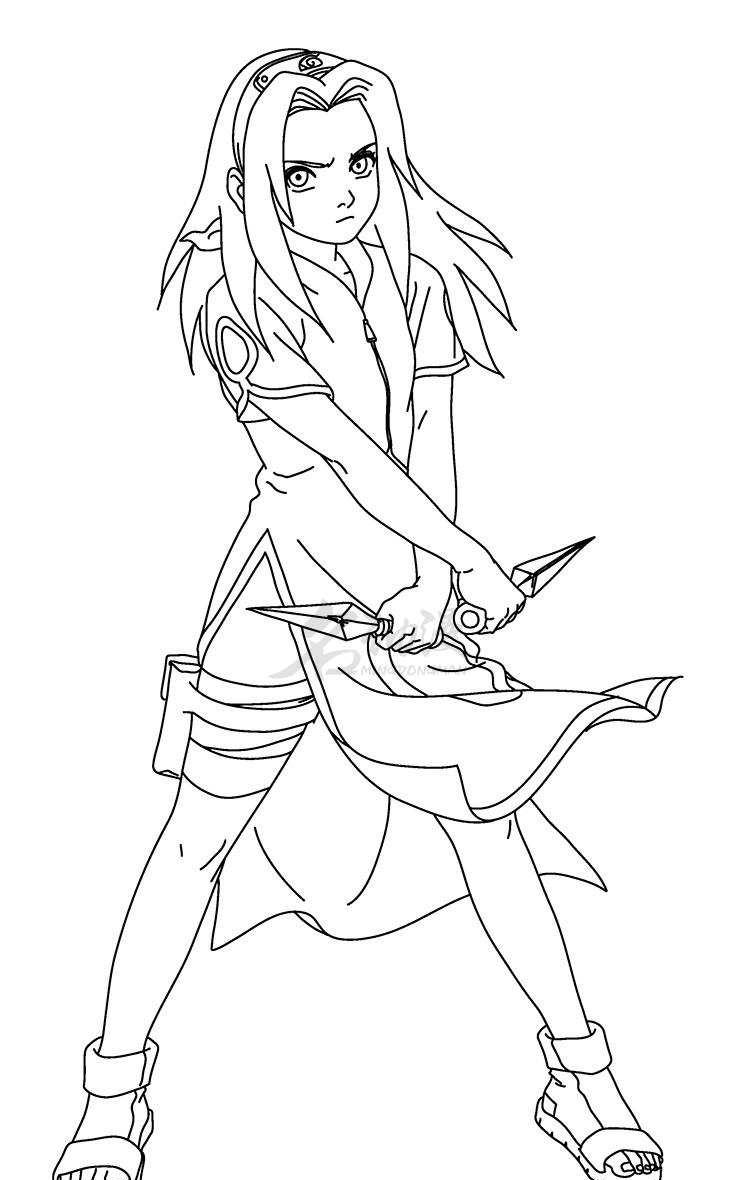 第二步:首先画出春野樱的眼睛和眉毛,然后是嘴巴和鼻子的部分,这样脸部就大体画好了。接下来开始画春野樱的头发,为了表现层次感,可以将头发分成几束来画,这样前后关系十分明确。再然后画出衣领和裙摆上的细节,例如绑在大腿上的缠带和武器包,最后画上武器苦无以及鞋子和脚趾。