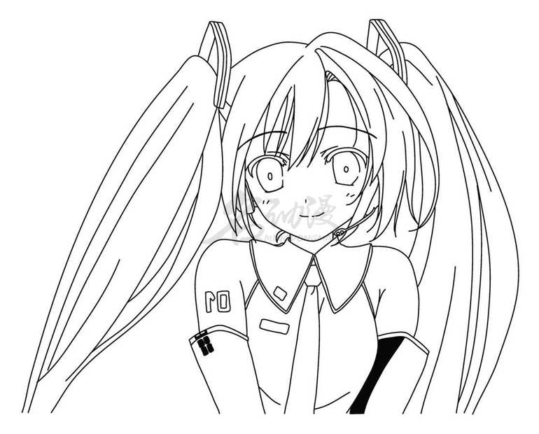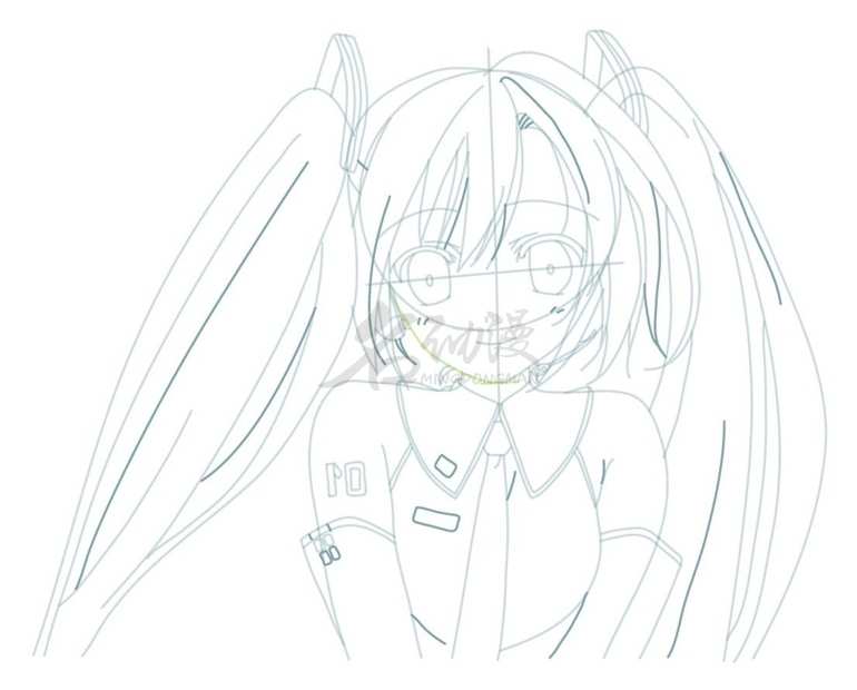 第一步:用线条概括出初音未来的整体外轮扣,比如双马尾、五官等等都要画出来,不用画得特别详细,最后概括出初音未来的衣领,这样初音未来的雏形就画好啦。