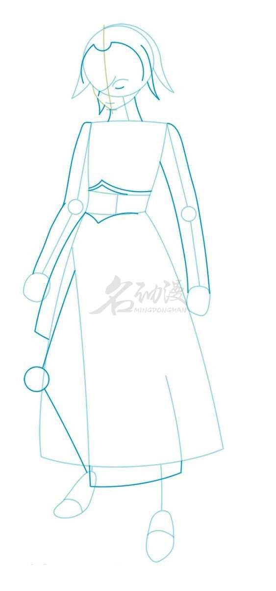第二步:到这一步,我们要将造型完善。首先将头部铠甲的形状塑造出来,再到头发与脖子部分。头部基本绘制完成之后,我们转向画衣服的造型,并将裙摆的细节刻画出来,比如褶皱、整体造型等等。然后画出手和腿的造型,最后画上眼珠子。