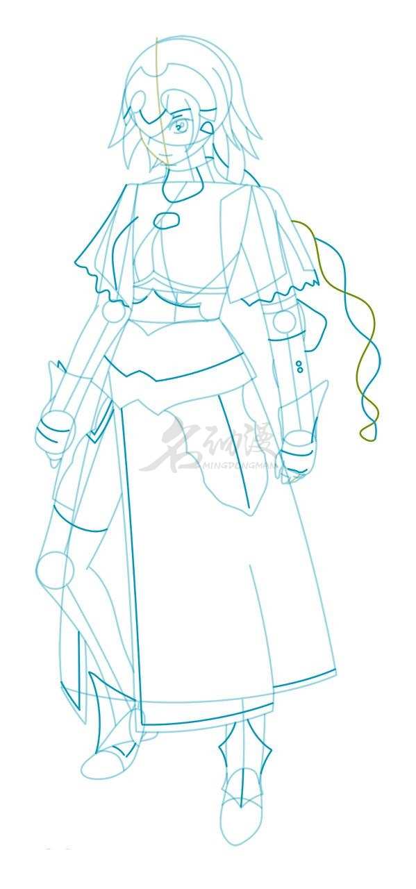 第一步:首先构思好贞德的动态以及整体的造型,再画出裙摆和腰带的雏形,然后画出头部的铠甲和头发,最后勾勒出五官的造型。这样,贞德的雏形就画出来了。