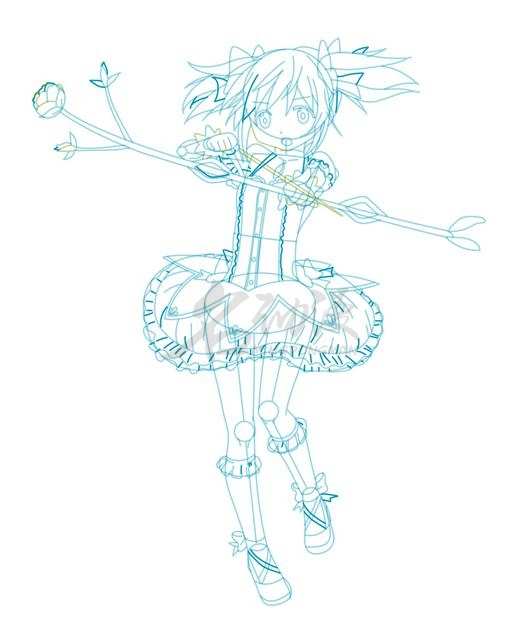 第一步:首先构思好小圆的动态姿势,再画出武器与裙摆的轮廓,到小圆的五官雏形,最后是头发的发丝走向。