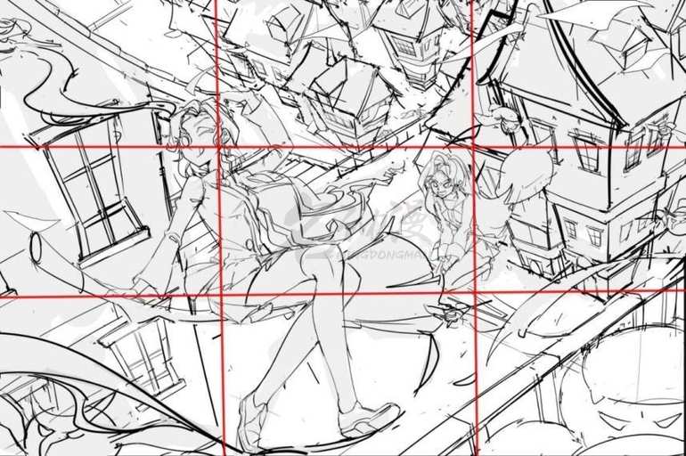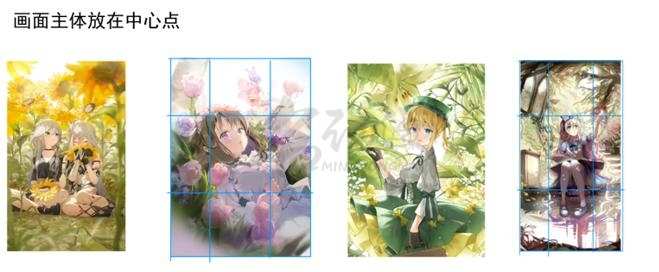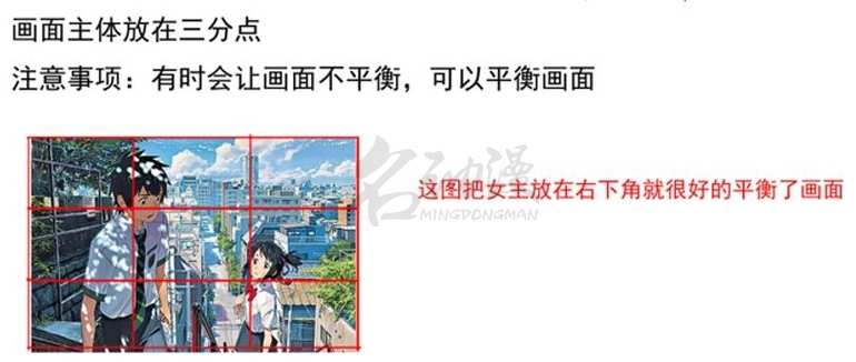 2.运用两分点构图。也可以称为两点对称平衡法,从画面中分割为两个部分,一个主要角色和一个次要角色。如图所示: