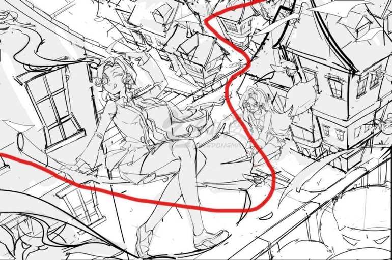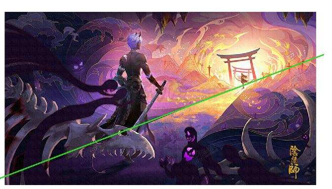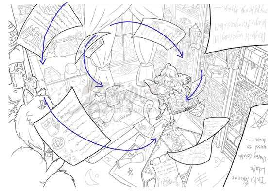 小哥:就例如我现在创作的哈利波特同人插画,运用到的是上面的曲线构图,在纵轴上起到上下前后的空间关系,人物和街道的动态在曲线的引导下把观众的注意力吸引到画面的焦点上,也是画面布局没那么呆板。