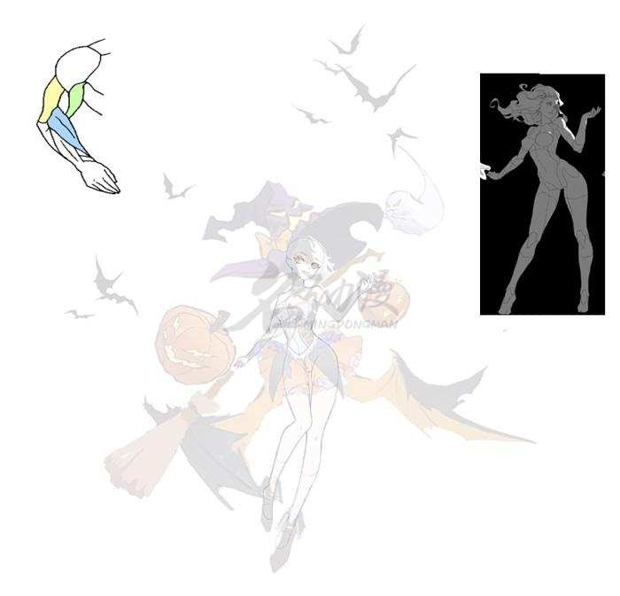 在画女巫人体结构时,要时不时水平翻转画布去检查,看看有没有错误,然后再进行修改。怎么观察与修改呢?这一步,我们就可以用到参考图,比如找一张姿势相差无几的图片和草稿放到一起,便于观察他的动作、人体结构的表现手法等,又或者是找一张手臂肌肉的图片进行参考。
