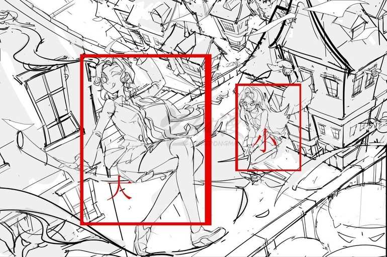小哥:如画面就运用到了对比构图,以小衬大,大的人物要比小的人物在画面中更加突出,使得内容更加的有趣。