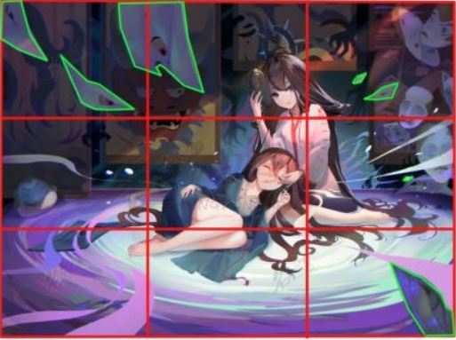 2.蓝色框起来的地方(画面中背景)和用绿色圈起来的地方(画面中人物的底下)形成了强烈的对比构图。