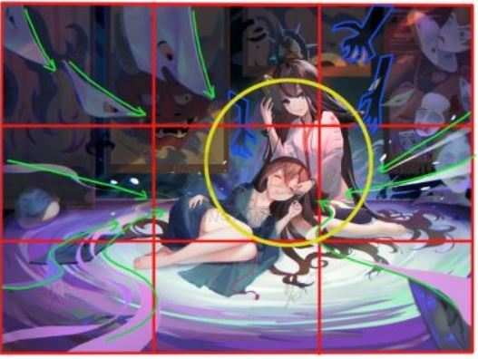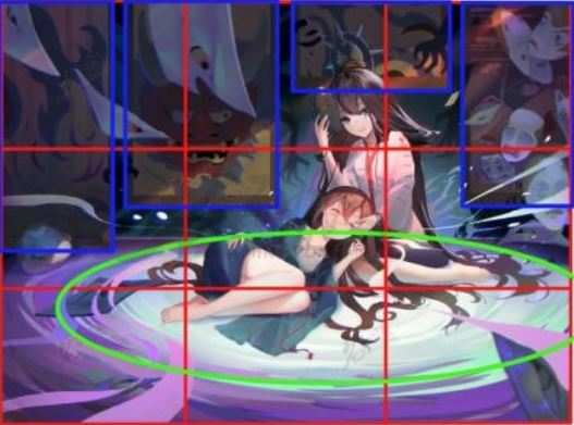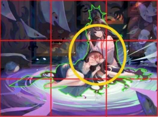1.在画面画上打上九宫格后,这就能更加清楚看出来画面的人物是被放置画面的右侧的三分点上的(画面中黄色圈的区域)。