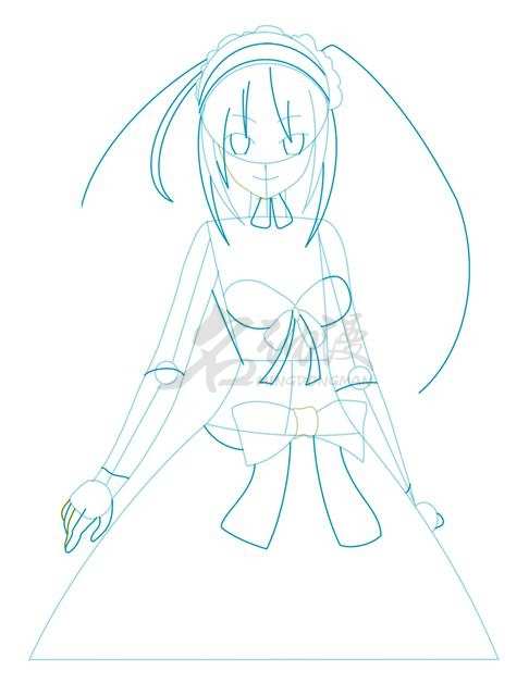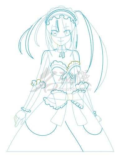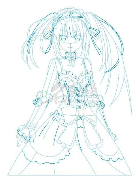 第一步:首先脑海中勾勒出时崎狂三的整体造型,脑中有了大概的想法之后就可以在纸上将时崎狂三画出来了。然后再适当地画上一些衣服上的蝴蝶或褶皱,最后画上五官,时崎狂三的整体雏形就画出来了。