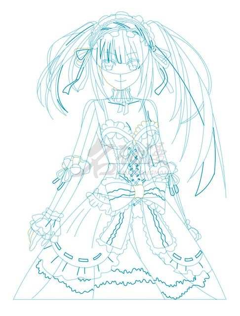 第二步:在第一步的基础上增加一些细节。首先,我们画出时崎狂三的眼睛,加深上眼睑画出瞳孔以及眉毛,再回过头来刻画时崎狂三的头发以及头上的发饰,最后把裙摆上的花纹、褶皱以及蝴蝶结以一画出。