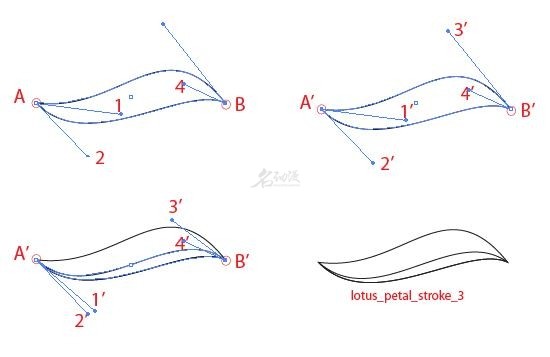这个形状只是半个莲花花瓣。现在,我们将绘制莲花花瓣的剩余一半,使用与步骤 2 中相同的方法。抓住选择工具并单击新创建的形状。复制此形状(编辑 > 复制或 Command + C)并将复制的形状粘贴到原始形状的前面(编辑 > 粘贴在前面或 Command + F)。现在抓住直接选择工具并单击 A' 点(A' 点与 A 点重合)。这一次,我们可以看到两个手柄(1')和(2')(如下图第二张图所示)。按住 Alt 键,将鼠标悬停在手柄 1' 上(应该会显示一个加号),然后单击并将其向下拖动到手柄 2' 附近。松开 Alt 键,单击 B' 点(B' 点与 B 点重合)。再次按住 Alt 键,将鼠标悬停在手柄 3' 上(应该会显示一个加号),然后单击并向下拖动它,如第三张图所示。将此形状命名为“3”。如图所示:
