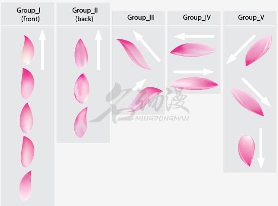 最后:将花瓣排列成一朵莲花。为了方便排列,我们将这些莲花花瓣分成五组。如图所示:
