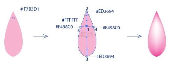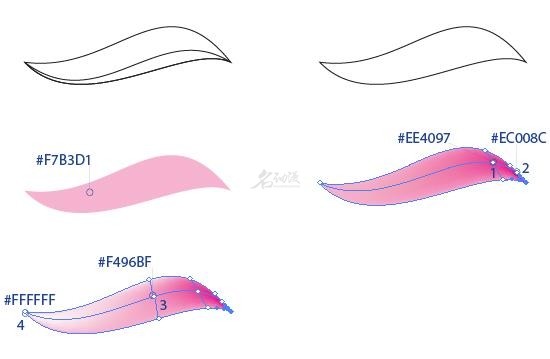 第四:使用网格样式为这个形状着色。选择网格工具并单击点 1。该点的填充为 #EE4097。点 2 填充了#EC008C。此时,我们的形状将类似于下面的第四张图片。接下来,使用网格工具单击点 3。该点填充为 #F496BF,点 4 填充为 #FFFFFF。如图所示: