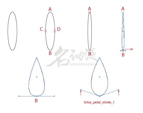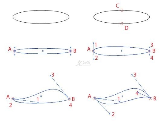 现在继续画一个不同的莲花花瓣形状。选择椭圆工具(填充为无,描边颜色为黑色,描边大小为 1 磅)并绘制一个椭圆形状。接下来,使用直接选择工具并单击 C 点,同时按住 Shift 键,然后单击 D 点以选择两个点(C 和 D)。然后单击属性栏中的“删除选定的锚点”图标以删除两个点(C 和 D)。我们的形状应该看起来像下面的第三张图片。使用直接选择工具单击 A 点,我们将看到两个手柄(1 和 2)。按住 Alt 键,将鼠标悬停在手柄 1 上(应该会显示一个加号),然后单击并向下拖动它,如第五张图所示。松开 Alt 键,单击 B 点,我们将看到两个手柄(3 和 4)。再次按住 Alt 键,将鼠标悬停在手柄 3 上,然后单击并向上拖动,如第五张图所示。继续使用这种方式拖动两个手柄(2 和 4),按照第六个图像中显示的方向进行操作。如图所示: