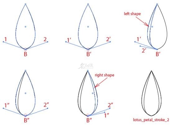 从第一个形状创建第二个形状。选择选择工具,按住 Alt 键,单击“1”形状,并将其拖动到新位置。我们将使用这种新形状。复制此形状(编辑 > 复制或 Command + C)并将复制的形状粘贴到原始形状的前面(编辑 > 粘贴在前面或 Command + F)。现在抓住直接选择工具,单击 B' 点(B' 点与 B 点重合)。这一次,我们可以看到两个手柄(1')和(2')(如下图第二张图所示)。按住 Alt 键,将鼠标悬停在右手柄 (2') 上(应该会显示一个加号),然后单击并将其向左拖动(如第三张图所示)。继续绘制正确的形状,使用与上述相同的步骤,但单击并将左手柄 (1") 拖动到右侧,如第五张图所示。将此形状命名为“2”。如图所示: