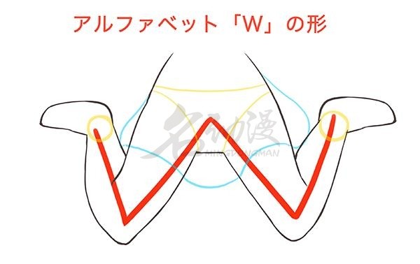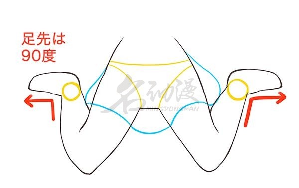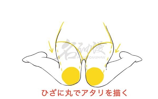 第三步:从前面看鸭子坐。首先,它是从前面的形状。正前方的构图可能是最困难的构图,因为它把透视放在膝盖和大腿上。在膝盖上画一个圆圈,然后画一个脚,很容易画。