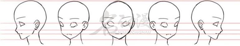 第三步:还有一些需要特别注意的是,绘制同一个人的不同转面是,眼鼻耳的位置始终是一样的,不会出现一个耳朵画太高、一个耳朵画太低的情况,如下图所示: