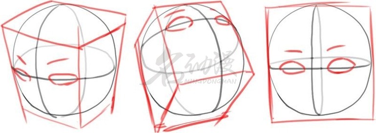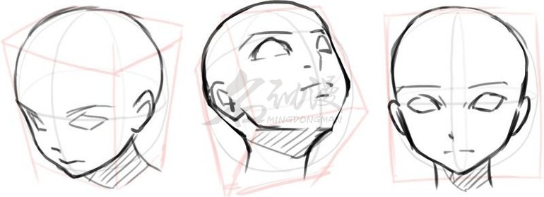 第二步:首先画一个立方体,将头部装进立方体里,然后在这个范围内画出有体积感的头部。注意我画得耳朵、下巴等都没有超出立方体这个框架哦。确定好头部之后,我们试着将五官加上去,然后画出瞳孔和高光,细化一下细节,这样头部就画好了。