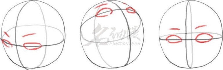第一步:首先,我们画一个圆圈,确定头部的大小。我想很多人会先从眼睛开始画画,但是先画眼睛的话就很难平衡,也很难确定头部的带下,所以最好先决定完成的大小,然后再开始画。画完圆形之后要记住了圆形不是扁平的,而是一个球体。我们在球体上画一个十字五官定位线,确定好位置之后就可以在五官定位线上画上眼睛啦。