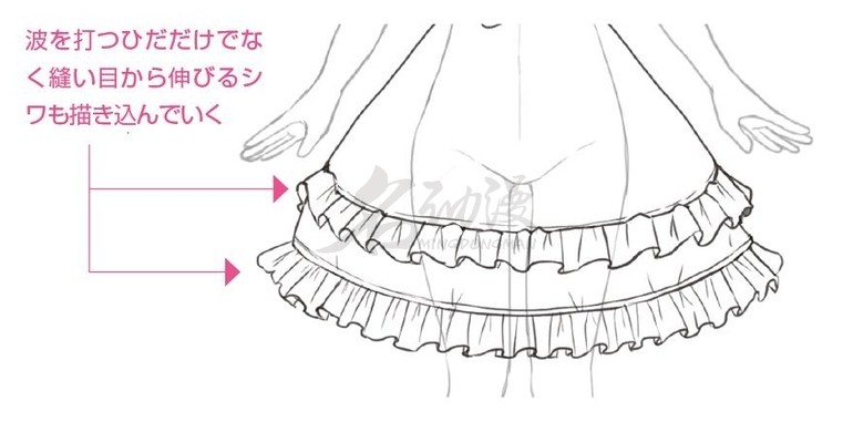 第三步:这一步我们我们在上一步的基础上进行细节的塑造,比如在裙摆上画上褶皱蕾丝边,这样可以更大程度上丰富裙子。