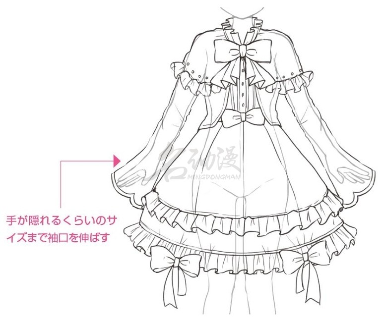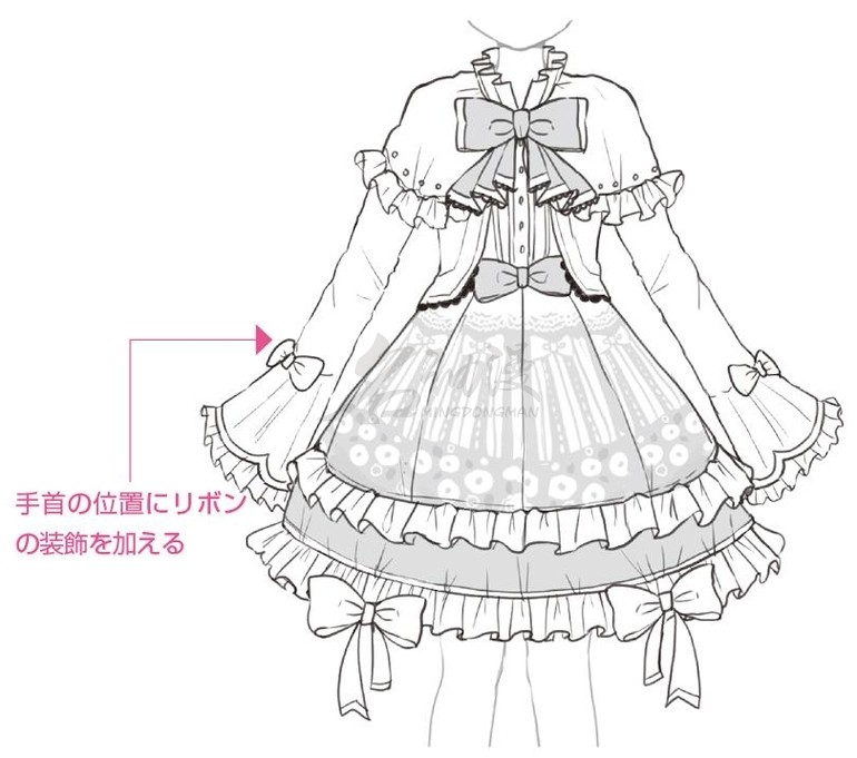 第五步:我们开始一步步丰富连衣裙的细节,画一个喇叭状的公主袖子,就像把手从博列罗包在手臂上一样。最后在裙子的下摆和胸部添加大丝带装饰。