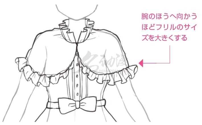 第四步:褶皱画完之后新建一个图层,在肩膀上画出一个短披肩,然后在披肩底部画上丰富好看的褶皱,最后画上立领,擦去多余的线条即可。